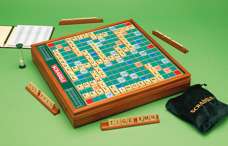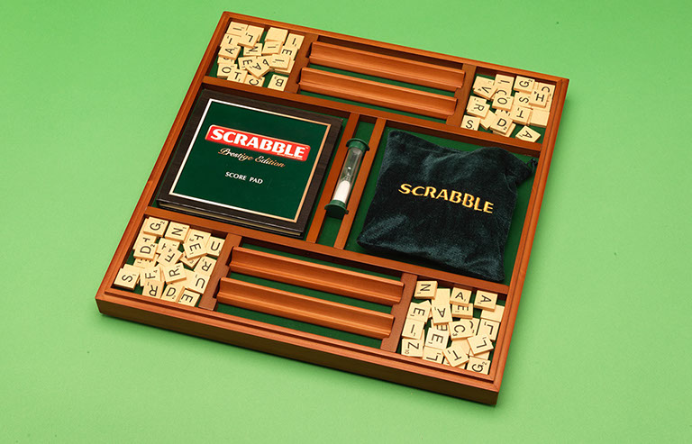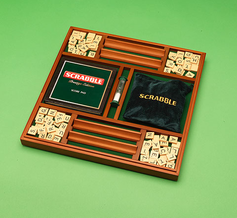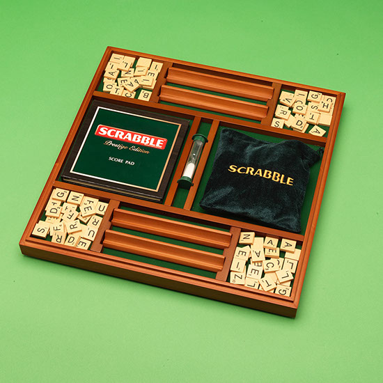 The perfect gift of words. A beautifully presented SCRABBLE® game in a wooden box with rotating turntable and integrated storage. The game comes with wooden tiles and racks, a sandtimer, scorepad and pencil, and the board features a gridded surface to ensure the tiles do not move around in play.