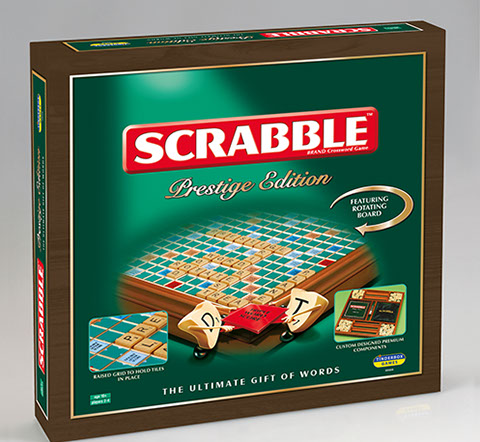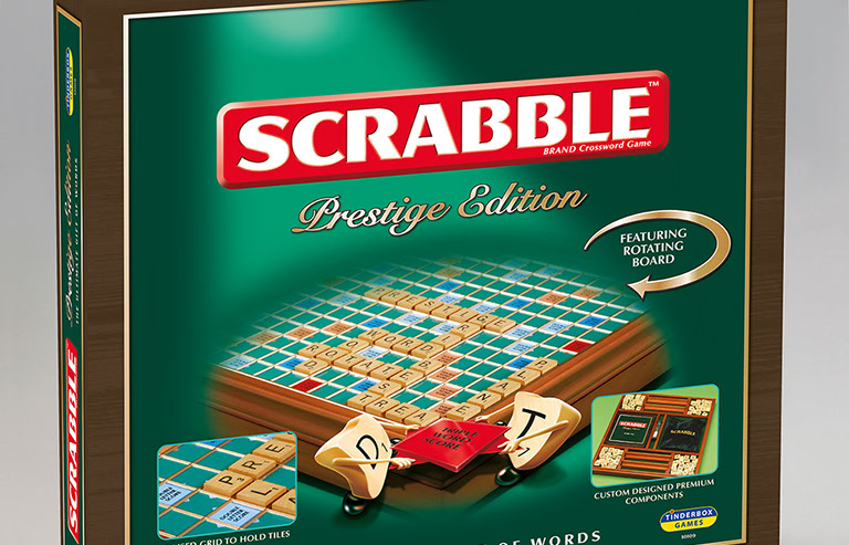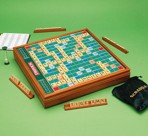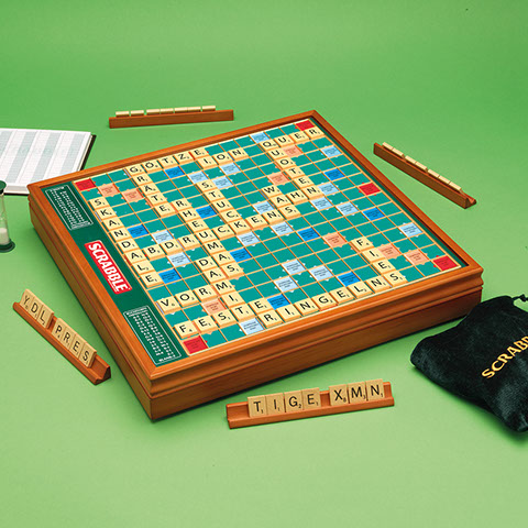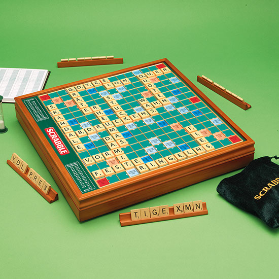 The perfect gift of words. A beautifully presented SCRABBLE® game in a wooden box with rotating turntable and integrated storage. The game comes with wooden tiles and racks, a sandtimer, scorepad and pencil, and the board features a gridded surface to ensure the tiles do not move around in play.